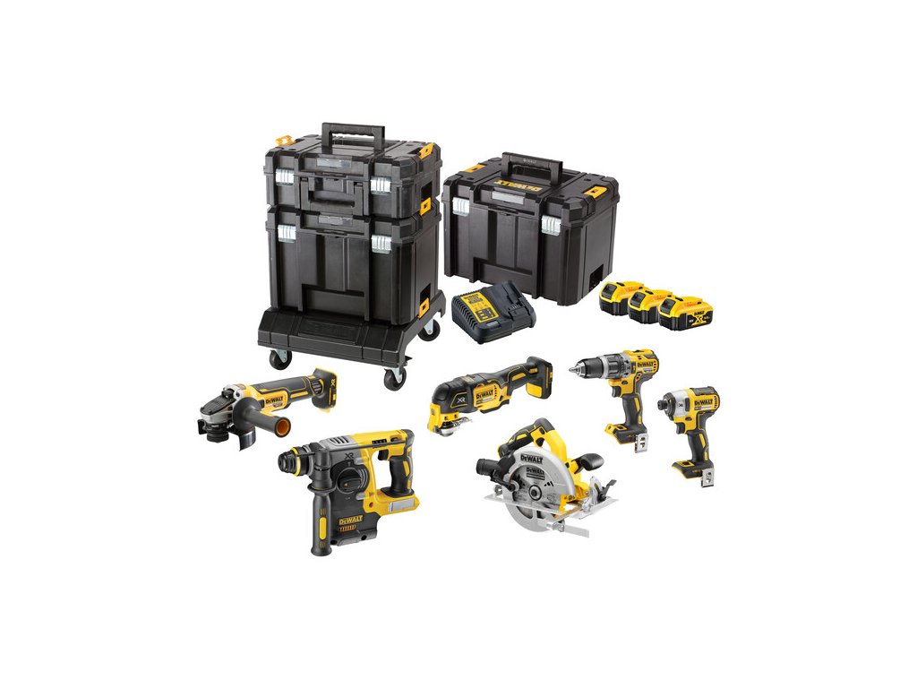 Kombo sada aku nářadí 18V DeWALT DCK685P3T obsahující úhlovou brusku DCG405, vrtačku DCD796, kombinované kladivo DCH273, rázový utahovák DCF887 , přímočarou pilu DCS335, kotoučovou pilu DCS570, tři akumulátory 5,0Ah, nabíječku a kufry TSTAK