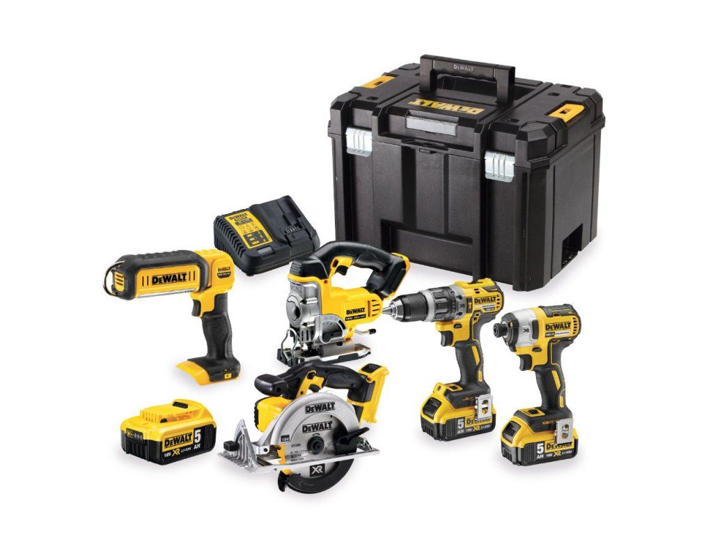 Kombo sada 18 V DeWALT DCK551P3T obsahující vrtačku DCD796, rázový utahovák DCF887, kotoučovou pilu DCS391, přímočarou pilu DCS331, světlo DCL050, tři akumulátory 5,0 Ah a kufry.